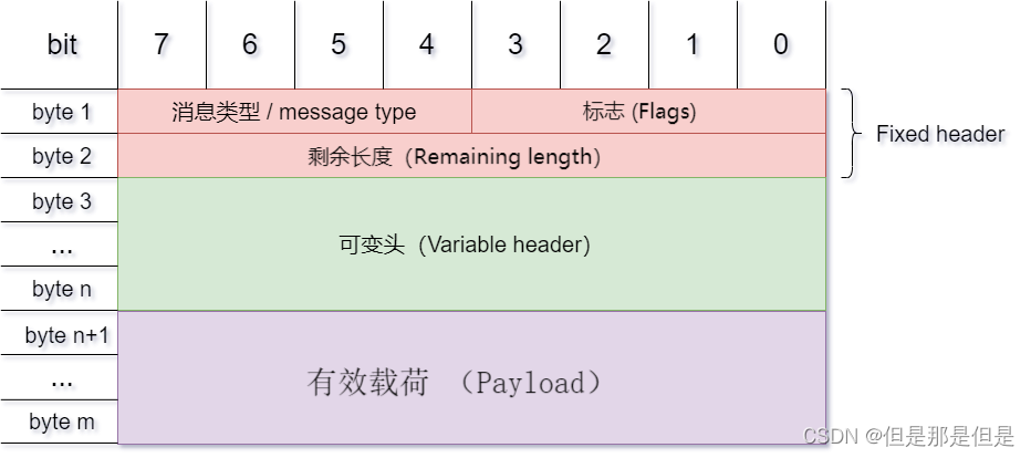 其中固定头必须有,可变头和消息体(有效载荷)在固定头的部分消息类型是可以没有。