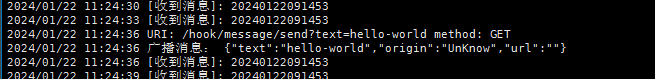 curl http://{服务器IP:服务端口}/hook/message/send?text=hello-world观察日志是否有正常: