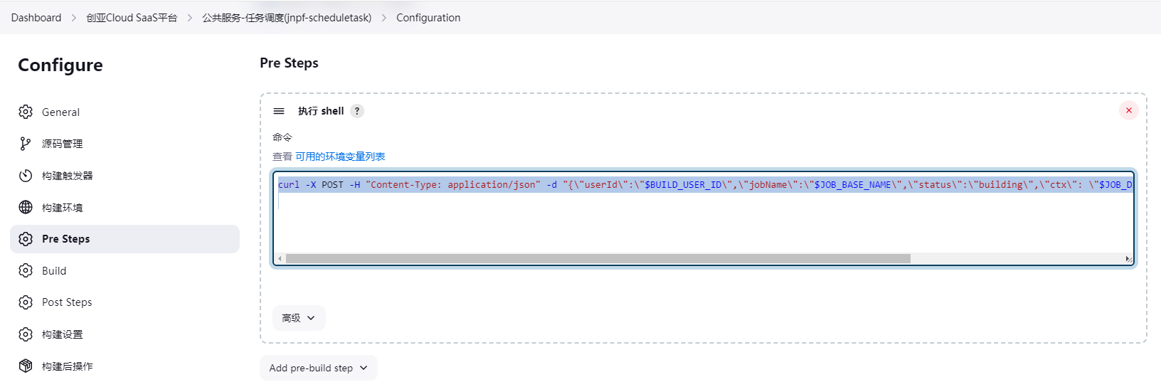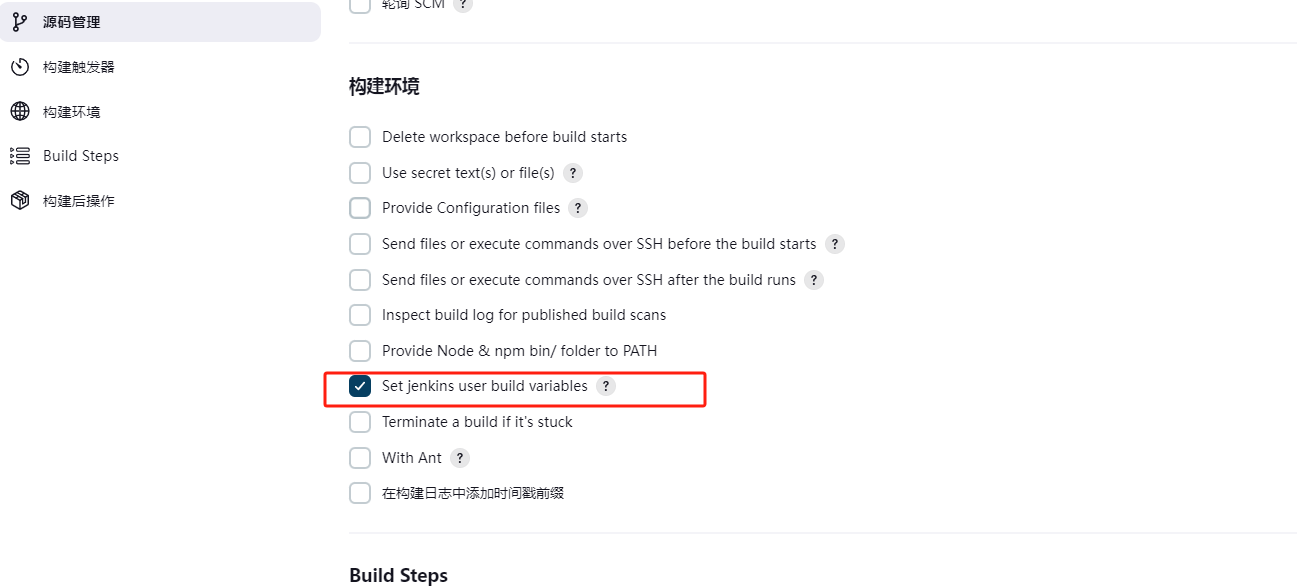 curl -X POST -H "Content-Type: application/json" -d "{"userId":"$BUILD_USER_ID","jobName":"$JOB_BASE_NAME","status":"building","ctx": "$JOB_DISPLAY_URL"}" http://192.168.2.36:8085/hook/jenkins构建环境选择使用Jenkins用户变量: